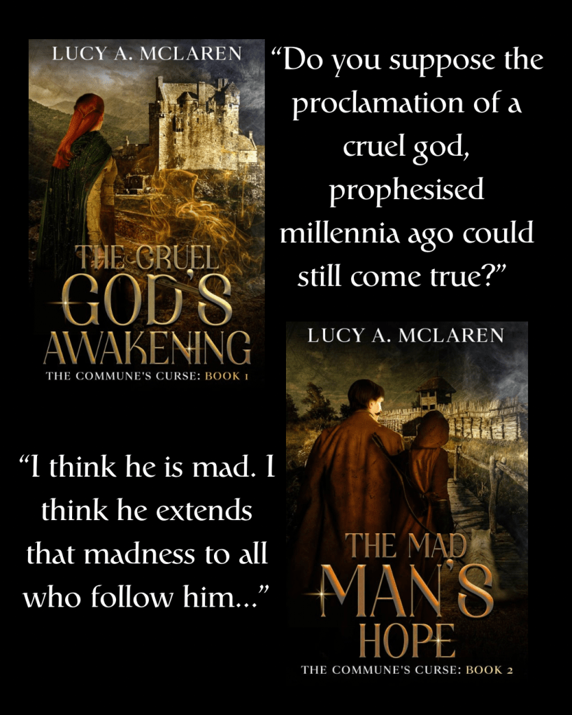 THE CRUEL GOD’S AWAKENING (THE COMMUNE’S CURSE: BOOK 1) (previously titled Awakening) and THE MAD MAN’S HOPE (THE COMMUNE’S CURSE: BOOK 2) are both available now. Book 3 is currently being written! 😊